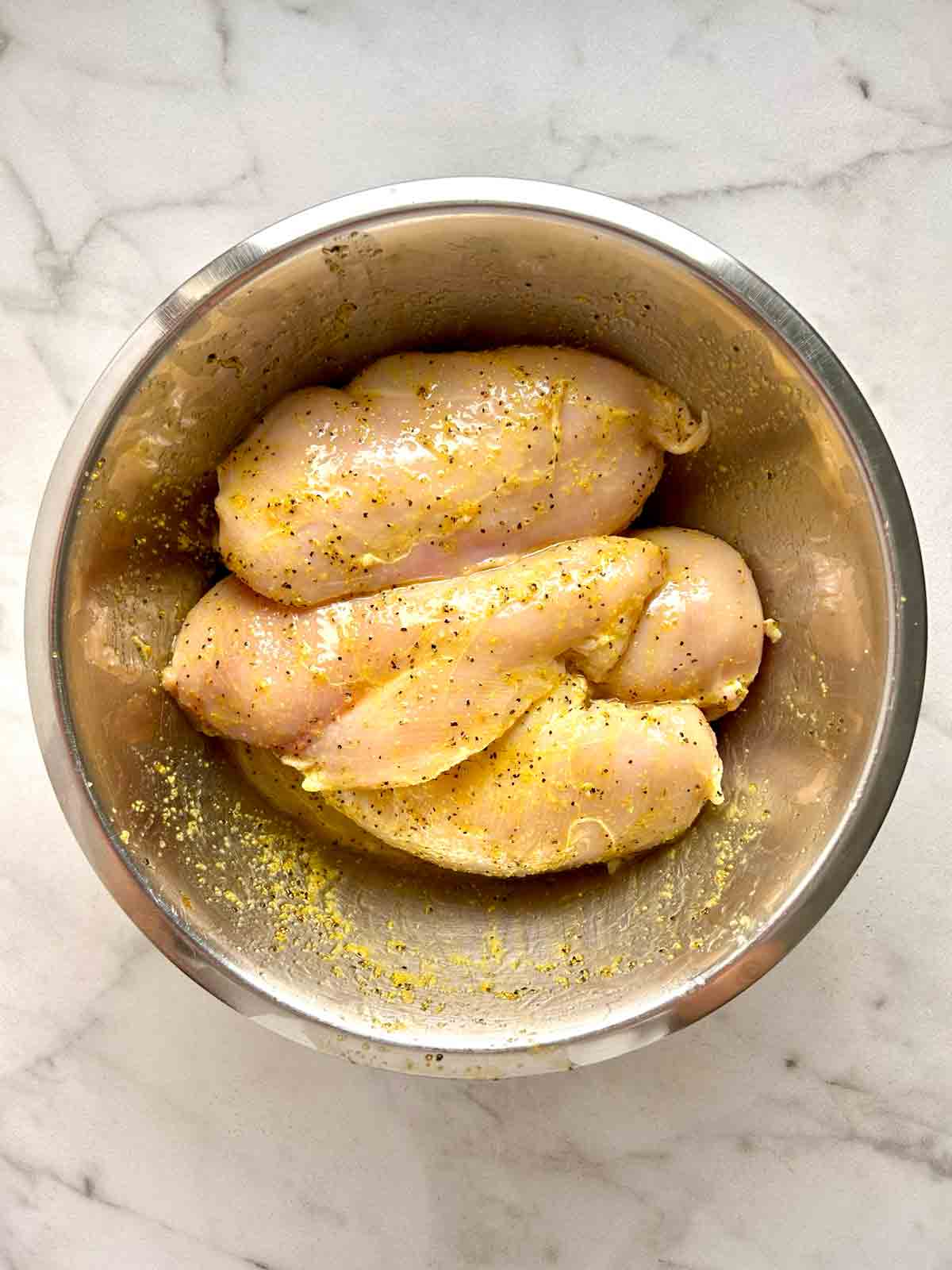 STEP 1: To a large bowl, add the chicken breasts, olive oil, lemon juice, and spices. Massage all over the chicken. Allow to marinate for 15 minutes (but ideally a few hours)