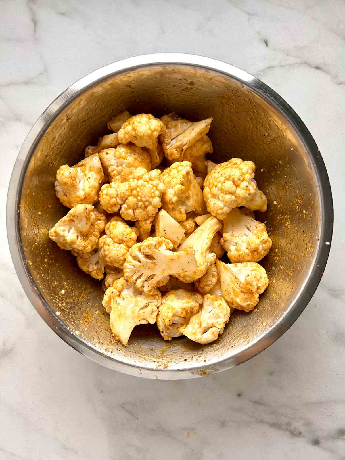 STEP 1: In a large bowl, toss the cauliflower with all the olive oil and spices.